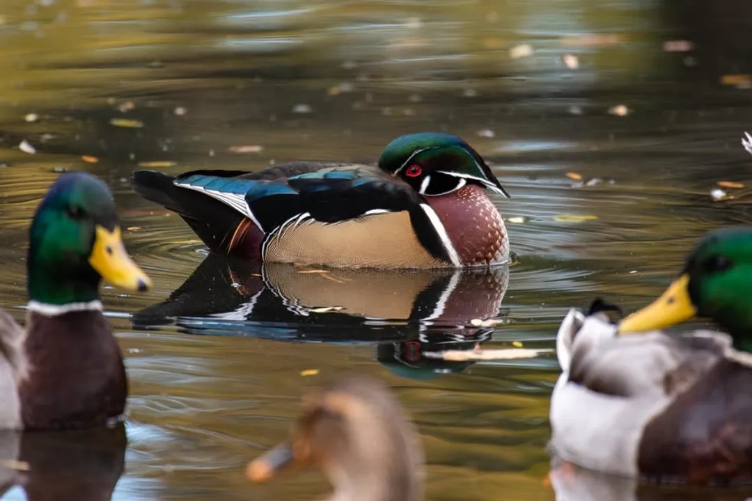 While the female Wood Duck possesses a more subdued overall plumage compared to the male, specific facial markings are crucial for accurate identification. The most reliable field mark involves the area surrounding her dark eye. She exhibits a prominent white eye-ring that completely encircles the eye. Furthermore, adjacent to this, there is a characteristic, elongated white patch shaped like a teardrop that extends noticeably backward from the lower border of the eye. These bright white features stand out clearly against her generally muted, grayish-brown head coloration, serving as the key diagnostic feature separating her from other female waterfowl species.