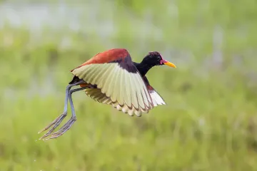 What physical trait allows the Jacana to walk easily across soft, floating vegetation?