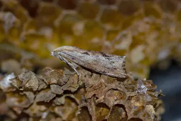 Which stage of the gypsy moth life cycle remains dormant and overwinters?What is the defining color and texture of a freshly laid gypsy moth egg mass?How many pairs of blue spots are present on the back of a mature gypsy moth larva, located toward the head?What is the primary method used to hold the gypsy moth pupa in place, unlike many other moths?What sensory organ feature distinguishes the adult male gypsy moth?What is the most significant physical restriction affecting the adult female gypsy moth?What is the typical resting posture that aids in identifying the adult male gypsy moth?What color is the predominant body and wing coloration of the adult female gypsy moth?When gypsy moth caterpillars first emerge, what is their initial size and general appearance?What features, believed to help deter predators, are present on the front of the gypsy moth larva's head?What characteristic behavior separates gypsy moth larvae from tent caterpillars?